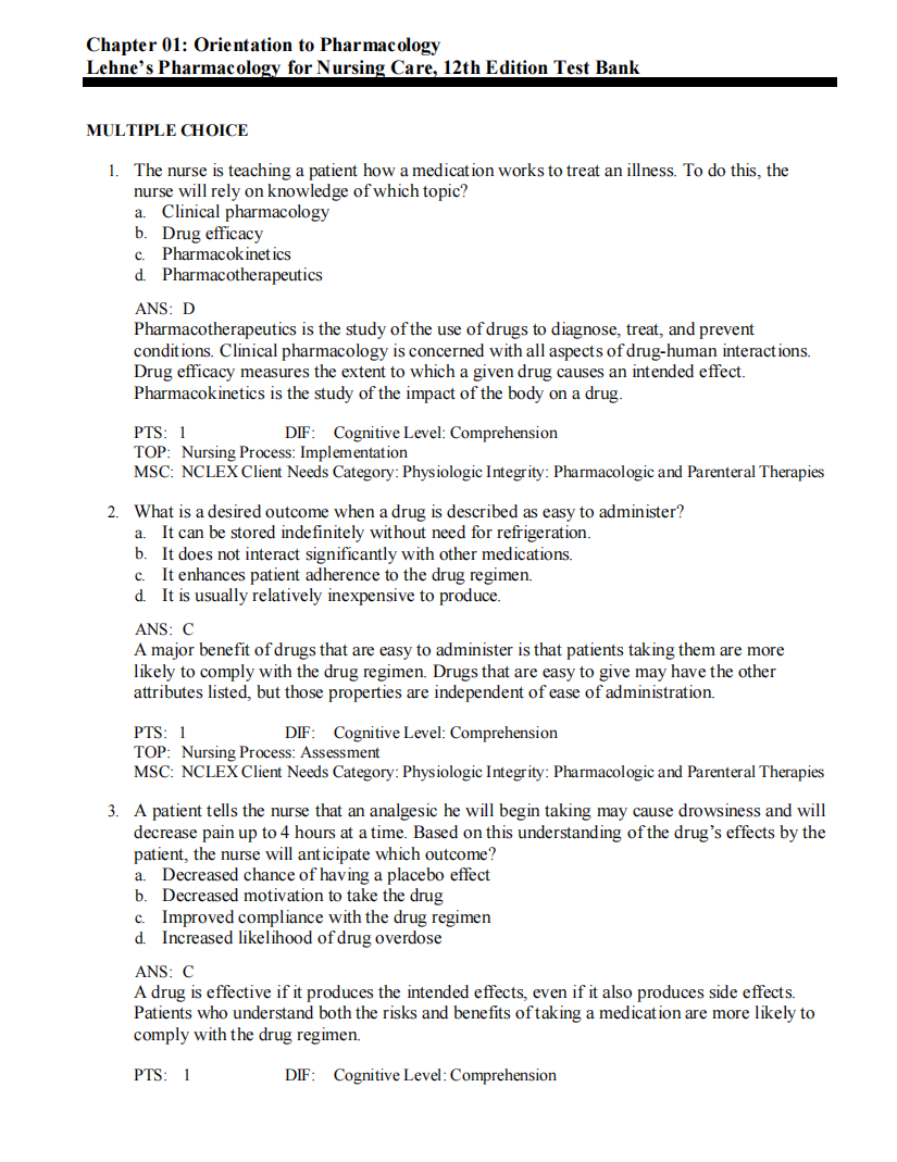 This test bank is created to accompany the 12th edition of Lehne’s Pharmacology for Nursing Care. It offers a detailed set of practice questions designed to help nursing students master core pharmacologic principles and prepare for exams.